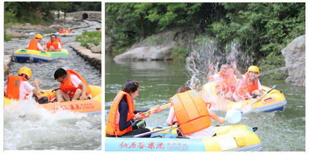懸崖峭壁陡立,山巒跌宕,水道蜿蜒險峻,水流急緩相見。員工們乘著皮筏順流而下,穿梭在蜿蜒流動的河中,盡情享受著山水唯美的浪漫情調,刺激的漂流也喚起了大家尋樂的童心,在河道中彼此你追我趕,飛濺的河水浸透了衣服,充分享受雨澆水淋的歡樂。兩個多小時的驚險刺激漂流讓大家驚心動魄、神情振奮、酣暢淋漓、叫人過癮。