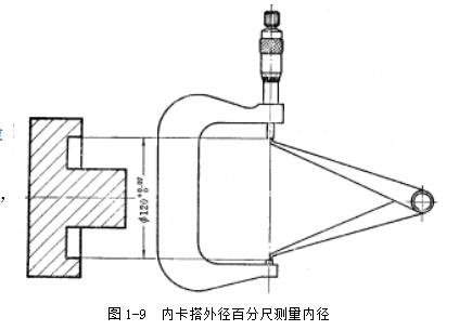 也能分辨得出。又如用內(nèi)卡鉗與外徑百分尺聯(lián)合測量內(nèi)孔尺寸時,有經(jīng)驗的老師傅完全有把握用這種方法測量高精度的內(nèi)孔。這種內(nèi)徑測量方法,稱為“內(nèi)卡搭百分尺”,是利用內(nèi)卡鉗在外徑百分尺上讀取準(zhǔn)確的尺寸,如圖1-9所示,再去測量零件的內(nèi)徑;或內(nèi)卡在孔內(nèi)調(diào)整好與孔接觸的松緊程度,再在外徑百分尺上讀出具體尺寸。這種測量方法,不僅在缺少精密的內(nèi)徑量具時,是測量內(nèi)徑的好辦法,而且,對于某零件的內(nèi)徑,如圖1-9所示的零件,由于它的孔內(nèi)有軸而使用精密的內(nèi)徑量具有困難,則應(yīng)用內(nèi)卡鉗搭外徑百分尺測量內(nèi)徑方法,就能解決問題。