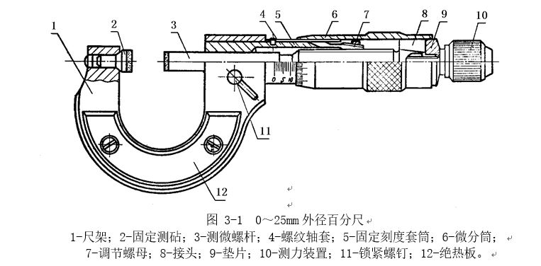 各種百分尺的結構大同小異,常用外徑百分尺是用以測量或檢驗零件的外徑、凸肩厚度以及板厚或壁厚等 (測量孔壁厚度的百分尺,其量面呈球弧形 )。百分尺由尺架、測微頭、測力裝置和制動器等組成。圖3―1是測量范圍為 0~25mm的外徑百分尺。 尺架1的一端裝著固定測砧2,另一端裝著測微頭。固定測砧和測微螺桿的測量面上都鑲有硬質合金,以提高測量面的使用壽命。尺架的兩側面覆蓋著絕熱板12, 使用百分尺時,手拿在絕熱板上,防止人體的熱量影響百分尺的測量精度。